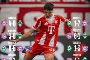 体育资讯2月14日讯 本轮德甲拜仁对阵不莱梅的比赛即将打响,拜仁官推也晒出两队近10次交锋战绩。