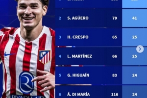 体育资讯2月19日讯 在欧冠附加赛马竞3-3战平布鲁日的比赛中,阿尔瓦雷斯破门。以下为阿根廷球员在欧冠历史进球榜: