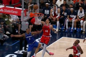 比赛剩余1分26秒,尼德豪泽防守贝恩上篮被吹罚干扰球,在与回放中心沟通后,确认球先碰到篮板,判罚无误。