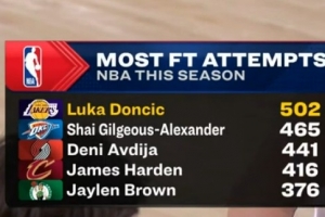 湖人主场迎战国王,东契奇赛季罚球数来到500个,联盟首人。