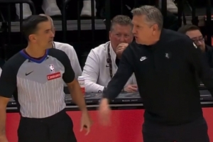 比赛最后24秒,森林狼主教练芬奇在场边大骂裁判,他冲裁判吼道:“闭嘴,你刚才漏了两次吹罚,你TM心知肚明,你TM明明知道(犯规了)!”