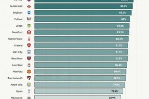 基于之前的数据分析,TA创建了一个“阵容稳定性评分”,衡量每个俱乐部在一个赛季内如何分配球员出场时间。简单来说,评分越高表示阵容越稳定,反之则表示主教练更频繁地更换球员。数据显示,水晶宫本赛季的阵容使用最为稳定,超过了埃弗顿、伯恩利和桑德兰。有些俱乐部拥有更大的阵容,因此在图表中排名较低的六支球队大多参加了欧战。