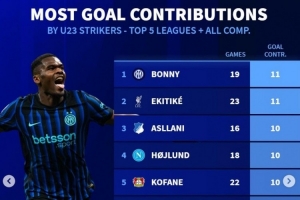 体育资讯12月20日讯 《转会市场》统计了本赛季五大联赛U23前锋各项赛事参与进球情况,博尼、埃基蒂克各参与11球最多。