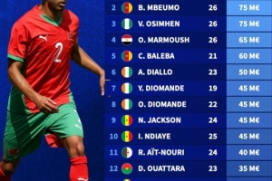 体育资讯12月27日讯 德转列出了本届非洲杯球员身价排行榜,阿什拉夫位列第一。