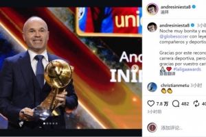 伊涅斯塔社媒晒出领奖的照片,配文:“度过了一个美好而特别的夜晚,与众多传奇、杰出伙伴和运动员们共聚一堂。”