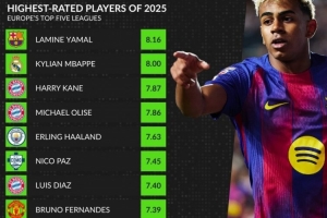 体育资讯1月3日讯 whoscored统计了2025年五大联赛场均评分榜,亚马尔力压姆巴佩居首。
