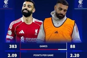 萨拉赫出场&不出场利物浦数据对比: