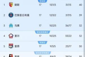 朗斯积40分排名法甲榜首,巴黎圣日耳曼积39分位居次席,据Opta统计,同一个赛季两支球队17轮过后积分39+,本世纪法甲第三次出现这样的情况,此前两次是2016-2017赛季、2022-2023赛季。