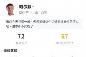 体育资讯1月18日讯 英超第22轮,切尔西2-0布伦特福德。帕尔默首发出战,打满全场,打进1粒点球,2次过人成功,2次拦截,评分7.3。