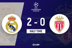 上半场补时2分钟,皇马2-0摩纳哥。