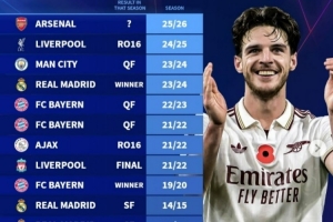 体育资讯12月11日讯 本赛季阿森纳在欧冠6战全胜,德转也盘点了欧冠历史前6场全胜球队最终成绩,其中皇马、拜仁曾拿到冠军,具体如下: