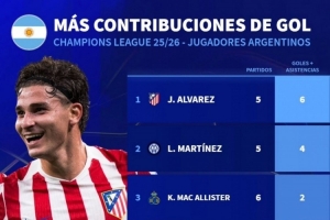 体育资讯12月12日讯 德国转会市场统计了本赛季阿根廷球员在欧冠的参与进球数量,并列出榜单。