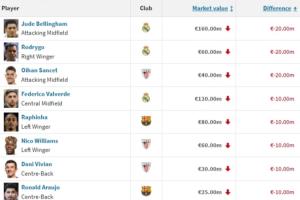 西甲身价跌幅榜:贝林+罗德里戈跌2000万最多,拉菲等6人-1000万