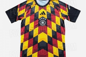 帅!德国队世界杯赛前训练球衣谍照:黑红金三色构建,几何V形图