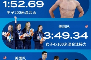 其中,马尔尚以1分52秒69的成绩刷新了男子200米混合泳的世界纪录。接力方面,美国队3分49秒34刷新女子4x100米混合泳接力世界纪录、美国队3分18秒48刷新了男女4x100米自由泳接力世界纪录。