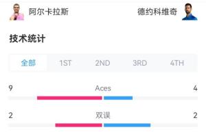 赛后双方数据统计,德约的非受迫性失误多大44次,而对手阿尔卡拉斯为27次,制胜分德约和阿尔卡拉斯32-35不相上下,Aces球阿卡9次,德约4次。