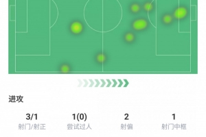 射门3次,射正1次,过人1次没成功,射偏2次,中柱1次,丢失球权2次,预期进球0.6球