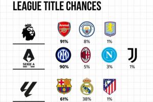下一篇: 五大联赛夺冠概率:阿森纳91%、国米90%、巴萨61%、拜仁98%