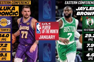 在1月,东契奇场均34.0分7.2篮板9.1助攻,湖人取得了9胜7负的战绩;杰伦·布朗场均29.2分7.9篮板4.6助攻,凯尔特人取得了10胜6负的战绩。
