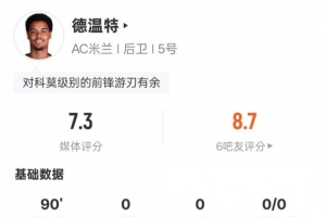 体育资讯2月19日讯 意甲第24轮,AC米兰1-1战平科莫。德温特首发出战,触球95次,6次抢断,7次对抗成功,均为全场最多,传球成功率达到97.6%,评分7.3。