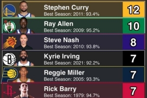 下一篇: 罚球命中率90+%命中率赛季数:库里12次历史最多 雷·阿伦10次