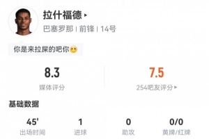 下一篇: 拉什福德数据:3射1正打进1球,2次错失进球1次关键传球,评分8.3