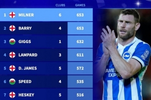 英超历史出场榜:米尔纳、巴里643场居首,吉格斯、兰帕德列三四